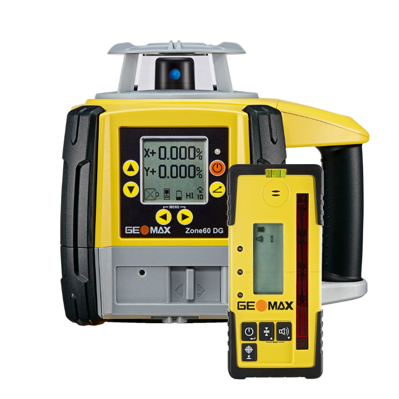 Rotačný sklonový laser Geomax Zone60 DG pre horizontálnu a vertikálnu rovinu a sklony v osiach X,Y. Zone60 DG môže mať sklon až 10,00 % súčasne v oboch osiach, X a Y, alebo až 15,00 % v jednej ose.
